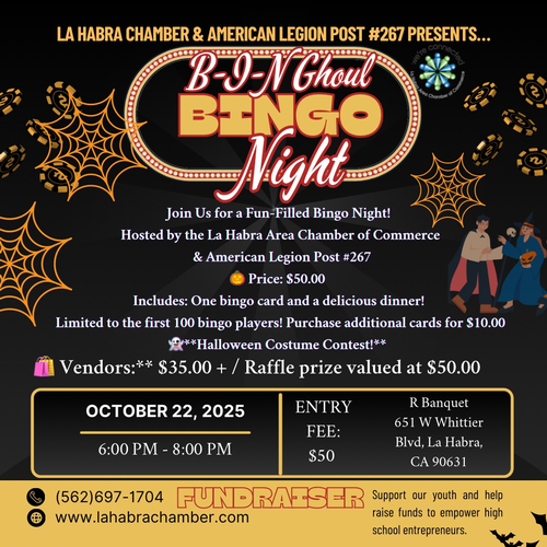 You are invited to a B-I-N Ghoul Bingo hosted by the La Habra Area Chamber of Commerce and the American Legion Post #267. Enjoy delicious food, bingo, and support small business vendors, prizes, and a costume contest.